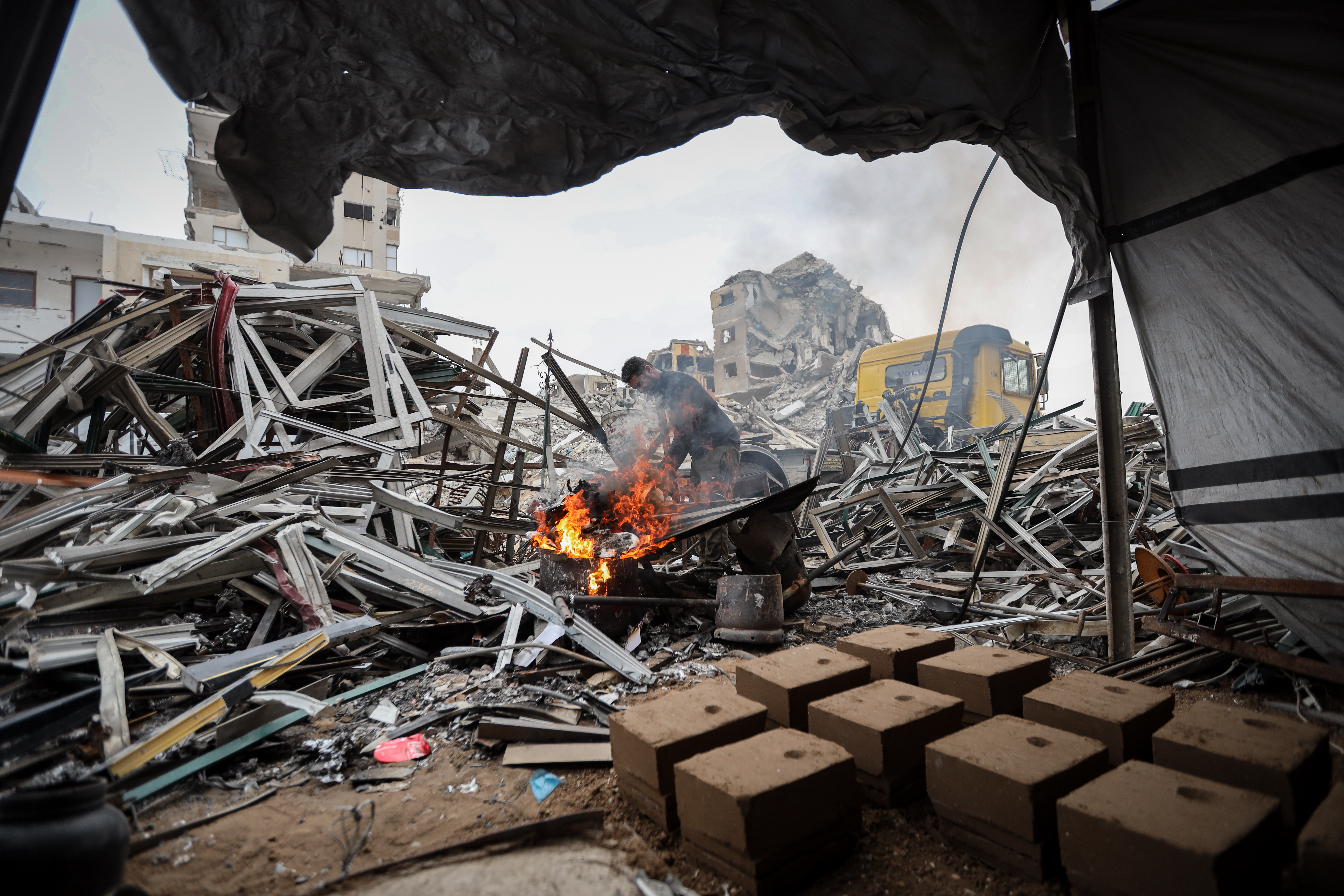دخان خفيف يتصاعد من موقد بدائي، بينما يقف البطش منحنيا فوق وعاء معدني يذيب فيه قطعاً من خردة الألمنيوم، وحوله أكوام من المعدن المستخرج من تحت ركام المباني المدمرة.